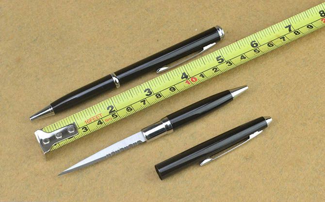 总长:13.5cm 刃长: 5.6cm 刃厚:0.12cm 刃宽:0.6cm 刃面:砂光 重量:17克 巧妙地将圆珠笔和小刀功能组合成一体,小巧便携,是理想的防卫工具,笔杆采用薄铜管.