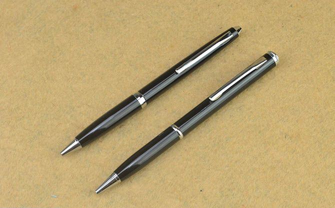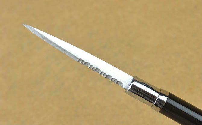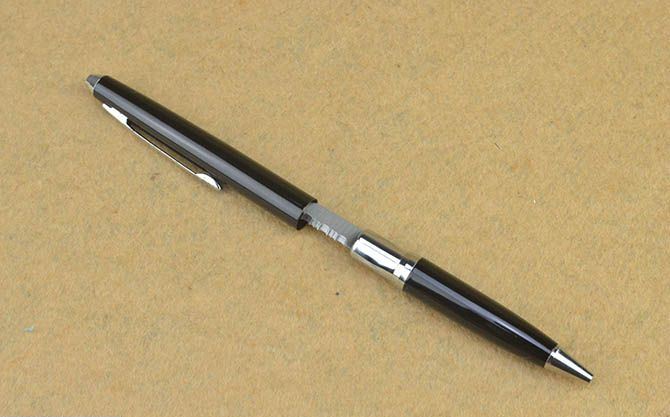 002多功能圆珠笔刀(黑色半齿) 总长:13.5cm 刃长: 5.6cm 刃厚:0.12cm 刃宽:0.6cm 刃面:砂光 重量:17克 巧妙地将圆珠笔和小刀功能组合成一体,小巧便携,是理想的防卫工具,笔杆采用薄铜管.