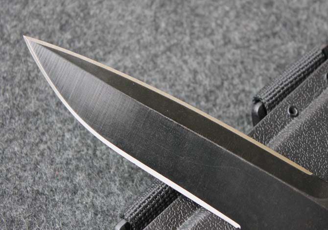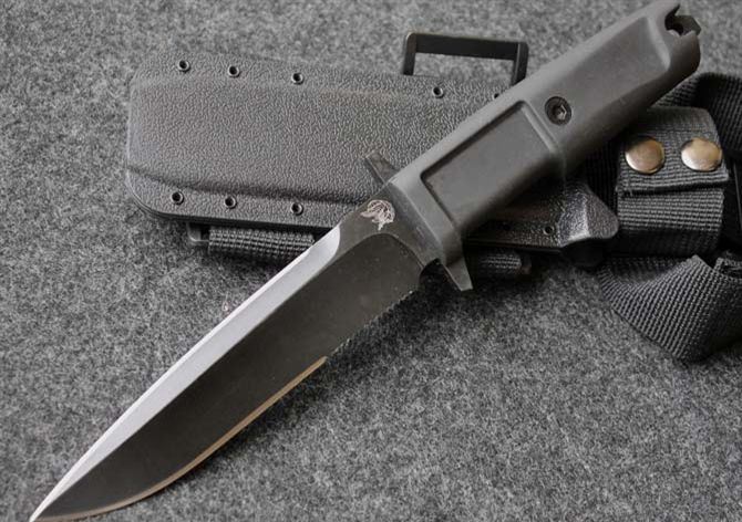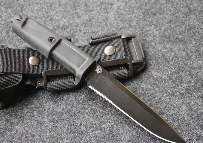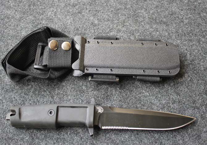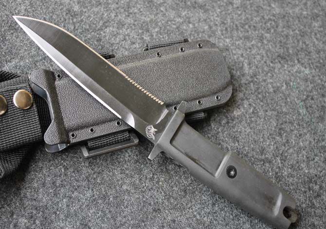 精仿极端武力现役校官配刀 全 长: 29cm 刃 长: 16cm 刃 厚: 6.7mm 刃 材: 7CR13 硬 度: 58HRC 重 量: 580g 表 面: 黑钛 柄 材: 橡塑 刀 鞘: ABS 刀身采用了先进的真空离子镀碳钛,双刃开锋,纯手工打磨具有优越的穿透性. 钢材为65MN(弹簧钢)尼龙刀柄,有弹性,手感非常好 刀鞘为ABS压制,配有绑腿带和加长腰带.完全按照正品1:1制作,所有的配件都可以和正品通用,刀刃部刻有意大利陆战队徽,专为意大利海军陆战队生产配备。
