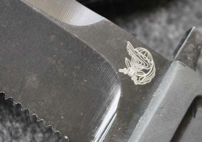 全 长: 29cm 刃 长: 16cm 刃 厚: 6.7mm 刃 材: 7CR13 硬 度: 58HRC 重 量: 580g 表 面: 黑钛 柄 材: 橡塑 刀 鞘: ABS 刀身采用了先进的真空离子镀碳钛,双刃开锋,纯手工打磨具有优越的穿透性. 钢材为65MN(弹簧钢)尼龙刀柄,有弹性,手感非常好 刀鞘为ABS压制,配有绑腿带和加长腰带.完全按照正品1:1制作,所有的配件都可以和正品通用,刀刃部刻有意大利陆战队徽,专为意大利海军陆战队生产配备。