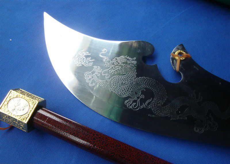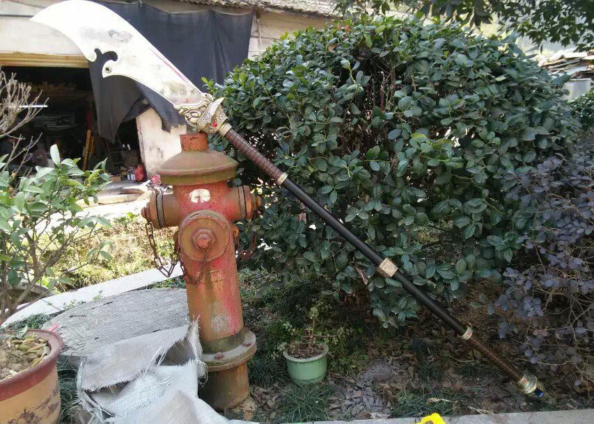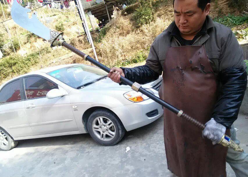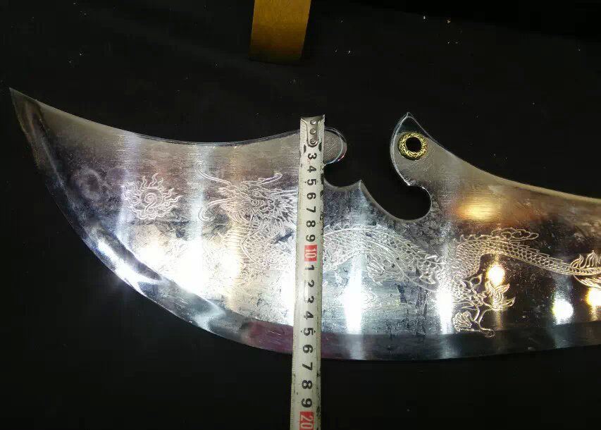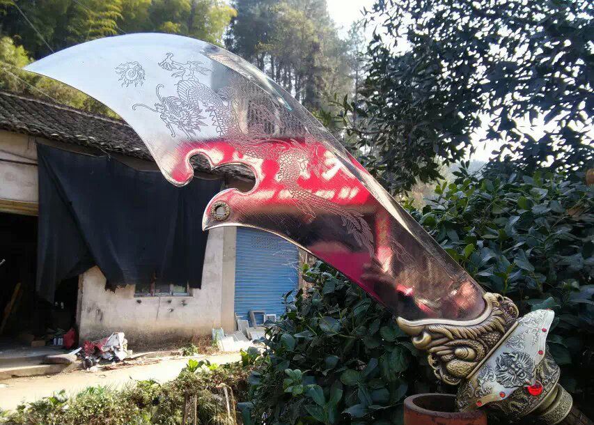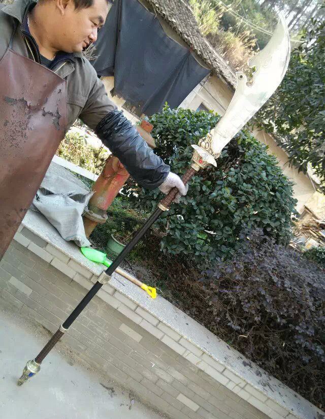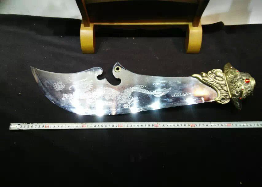 关公财神大刀 产品尺寸:总长度2.0米 分3截合在一起! 单刀净重:15斤 带立式架子重量:30斤左右 产品材质:不锈钢刀身,把手铁管 外层绕皮质,锌合金配件,是全金属的材质 此产品不包邮,大家注意选购