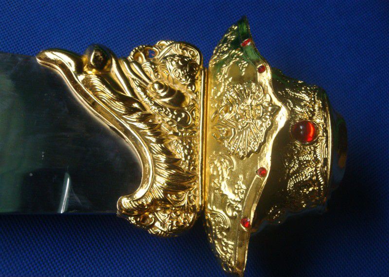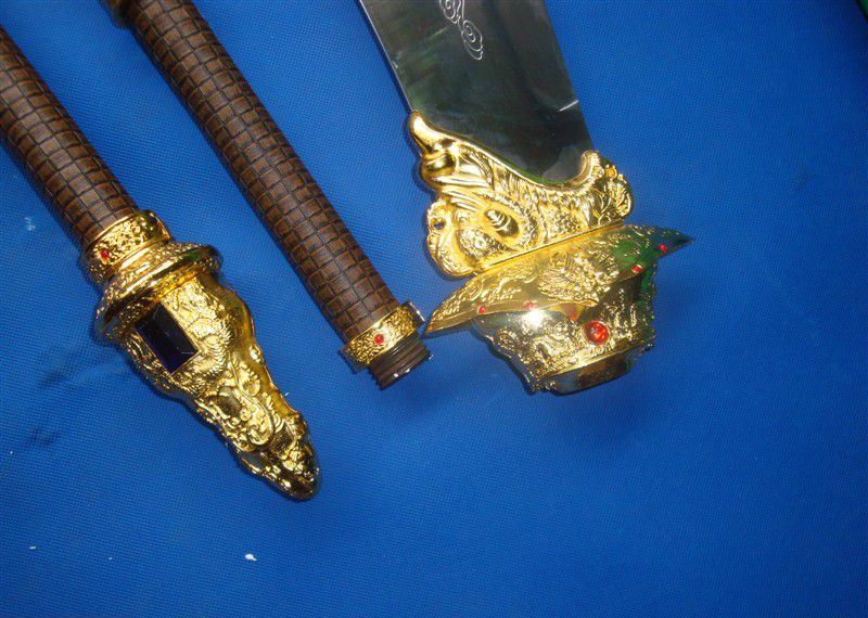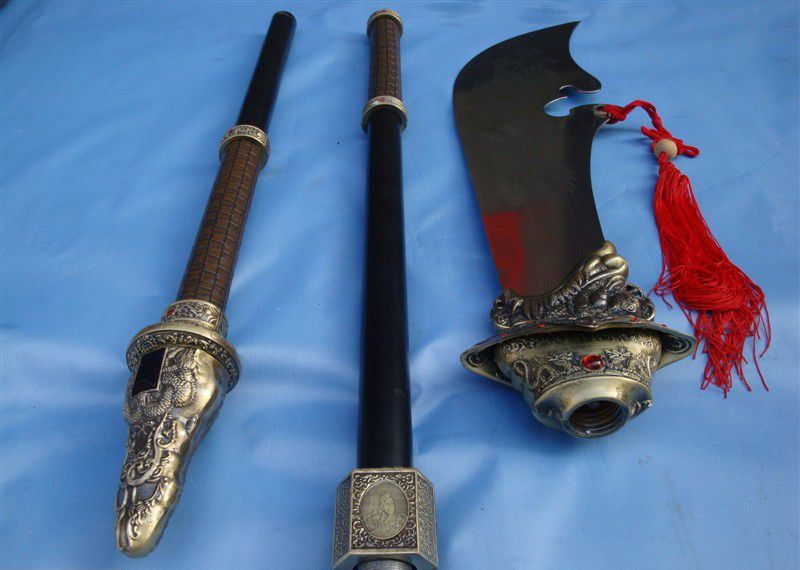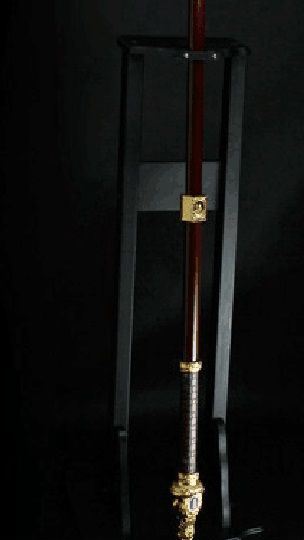 产品尺寸:总长度2.0米 分3截合在一起! 单刀净重:15斤 带立式架子重量:30斤左右 产品材质:不锈钢刀身,把手铁管 外层绕皮质,锌合金配件,是全金属的材质
