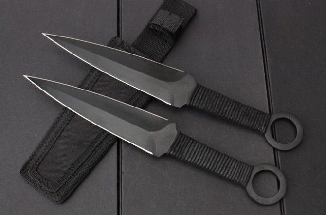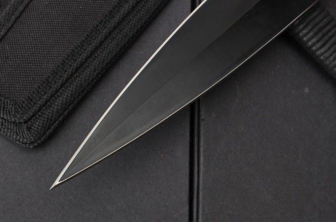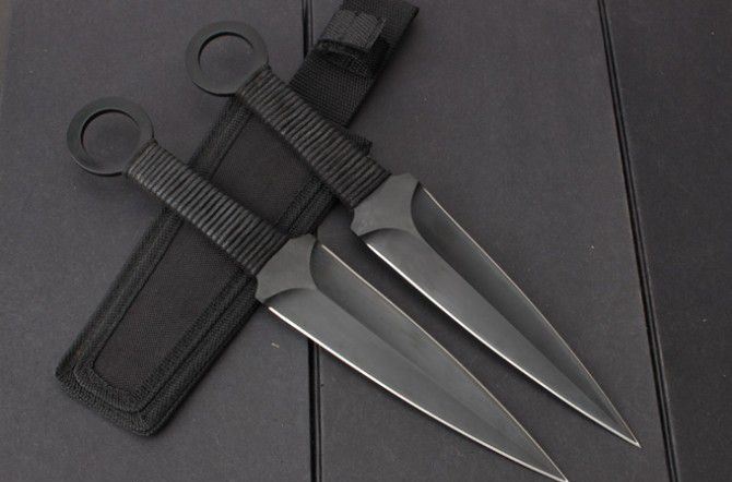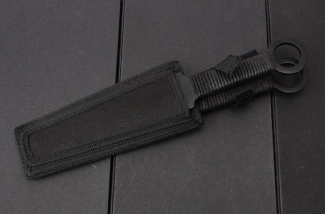 敢死队飞刀(两支装) 全长 :30.5CM 刃长 :17CM 刃厚 :0.5CM 最宽 :4.2CM 柄材 :一体缠粗绳子 刃材 :4 20不锈钢 表面 :焗黑漆面 重量 :185克(单只) 刀鞘 :尼龙(两支)