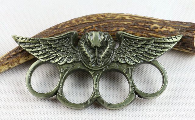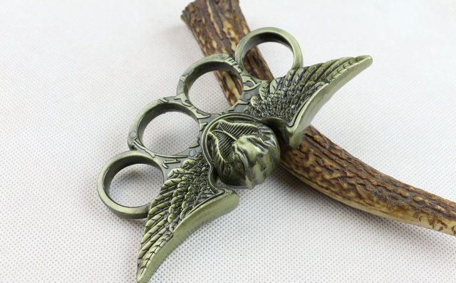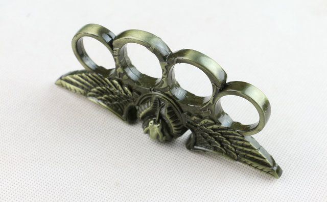 老鹰头四指拳套 规格:长11.8*高6.8*厚1CM 材质:压纹图案铸铁金属 重量:250克 戴上后可提升拳部的攻击力,而其用于格斗时套在手上,可以使拳头的威力暴增,只要用于自防卫,打破汽车玻璃自救等。