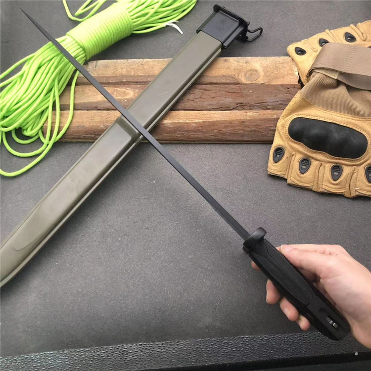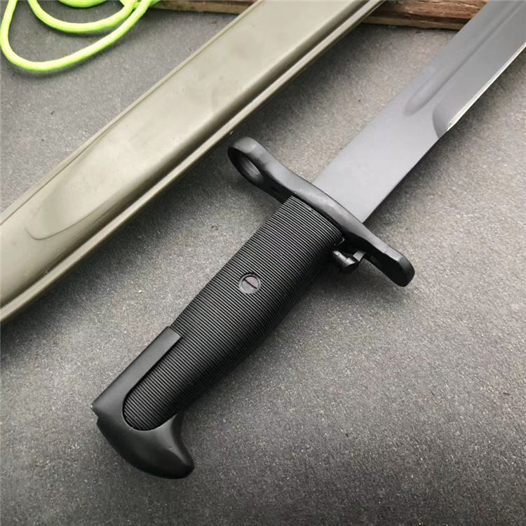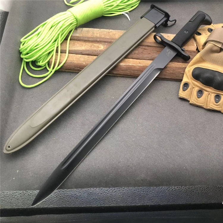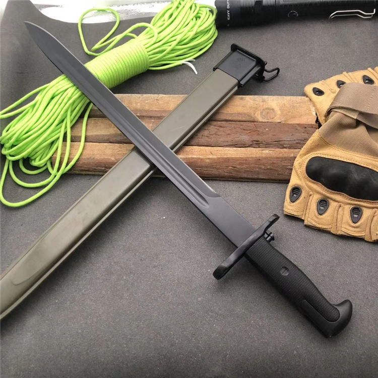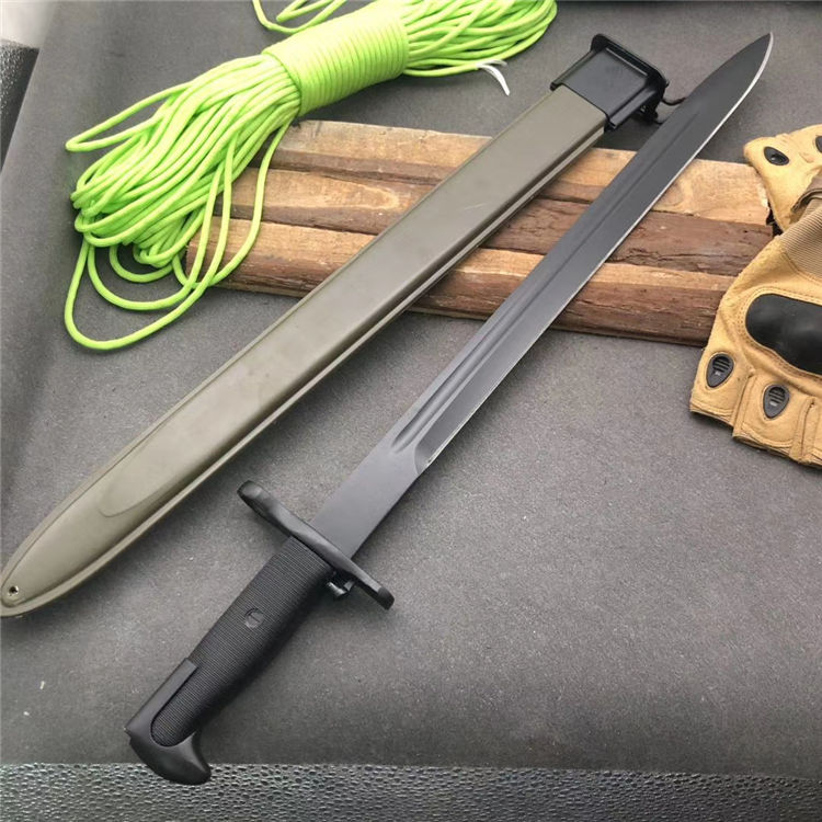 美国M1加长版 全长:51cm 刃长:39cm 刃宽:2.9cm 柄长:12cm 厚度:6mm 重量:710G 刃材:65#锰钢 硬度:58 刀鞘:纤维塑料刀鞘,鞘口有钢套,可穿腰带 柄材:精铸钢+纤维塑料(带防滑条纹)