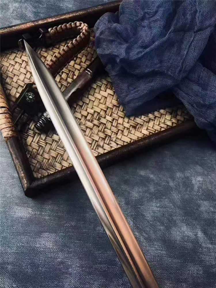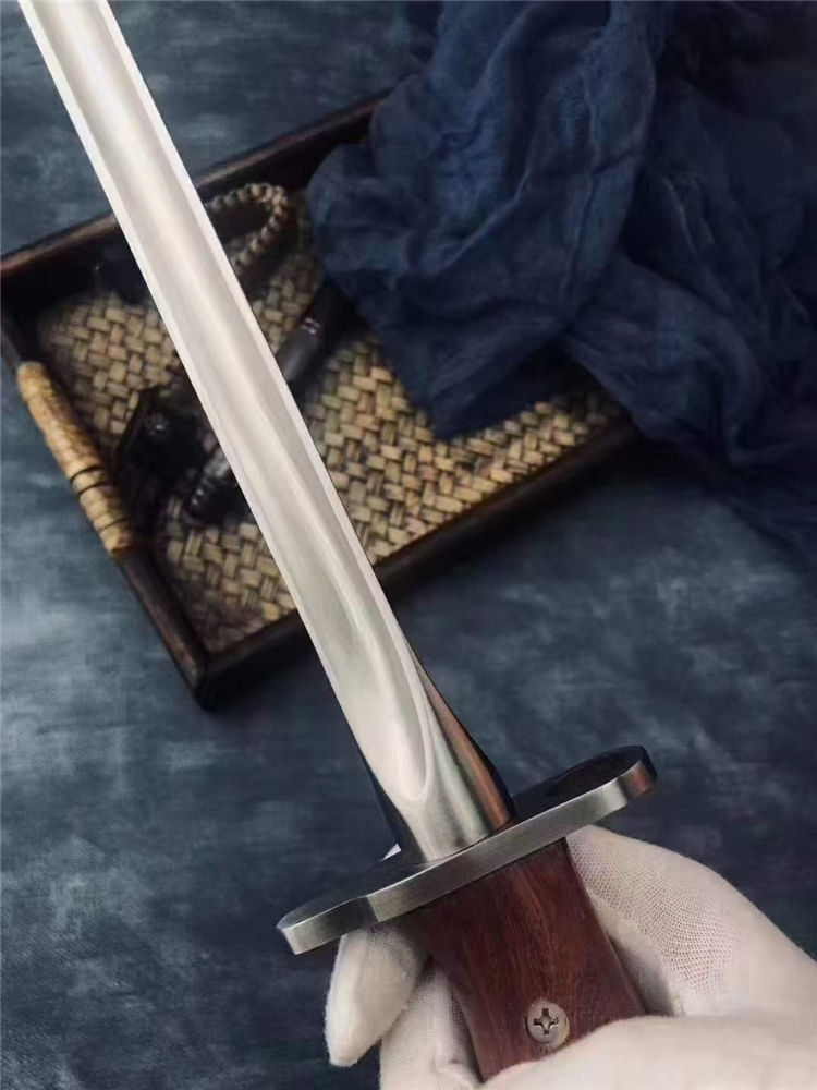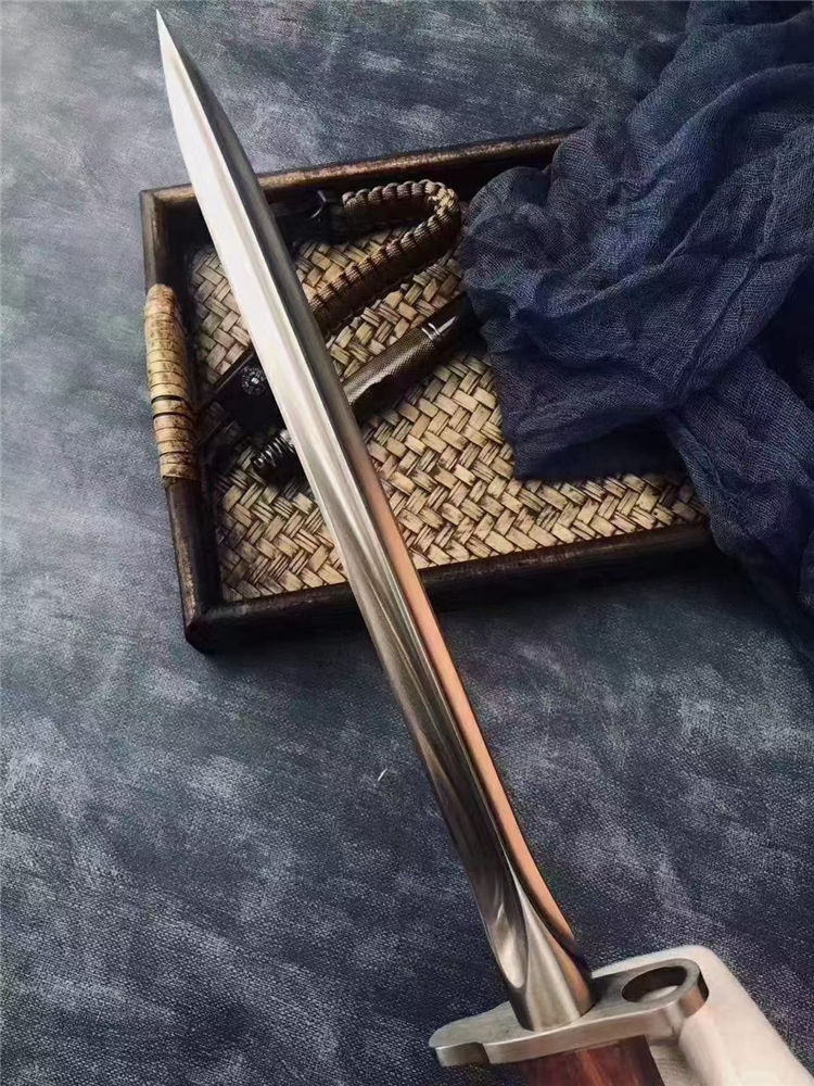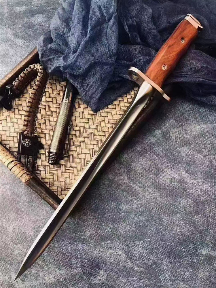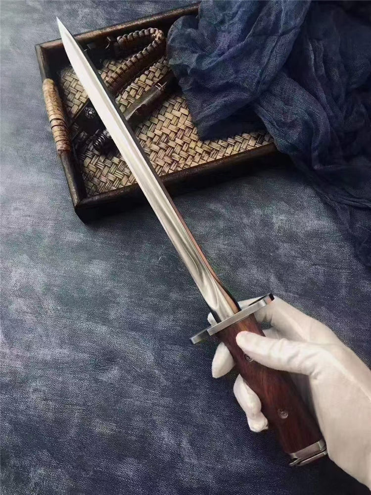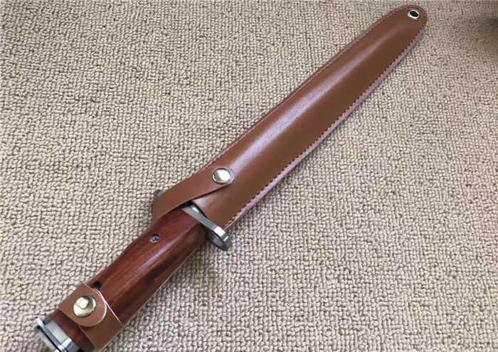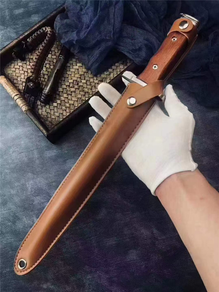 长 度:40CM 刃 长:28.5CM 刀直径:2.1CM 刀 重: 450g 毛 重:500克 硬 度: 56HRC 刀材质:430高碳不锈钢 柄 材:原木 附皮革刀套