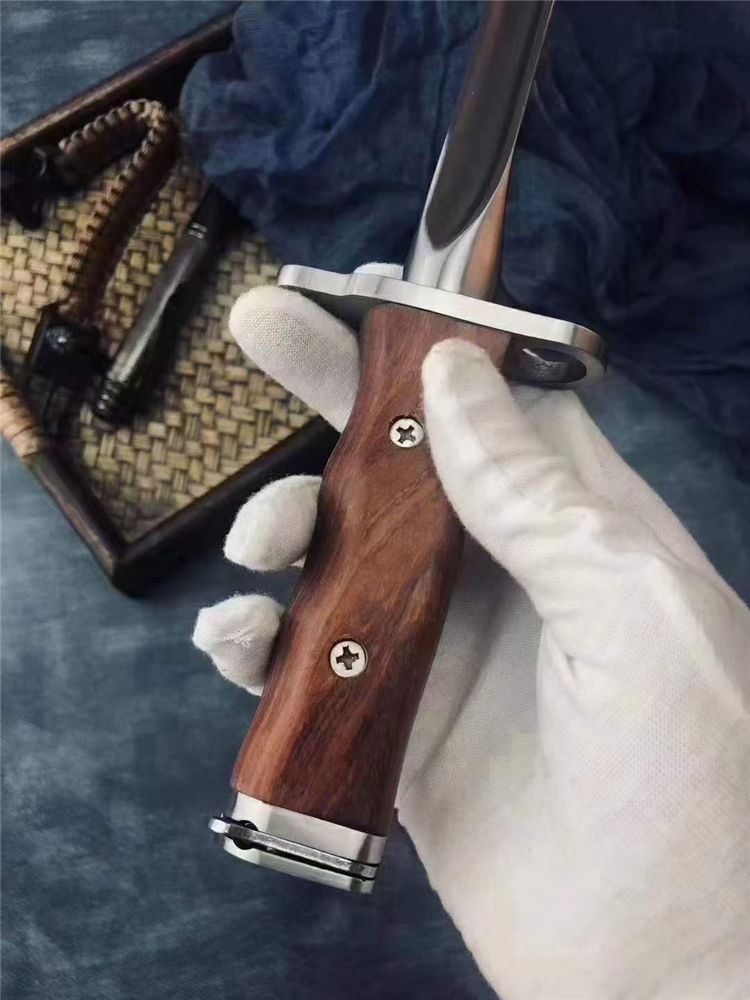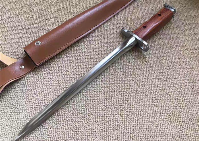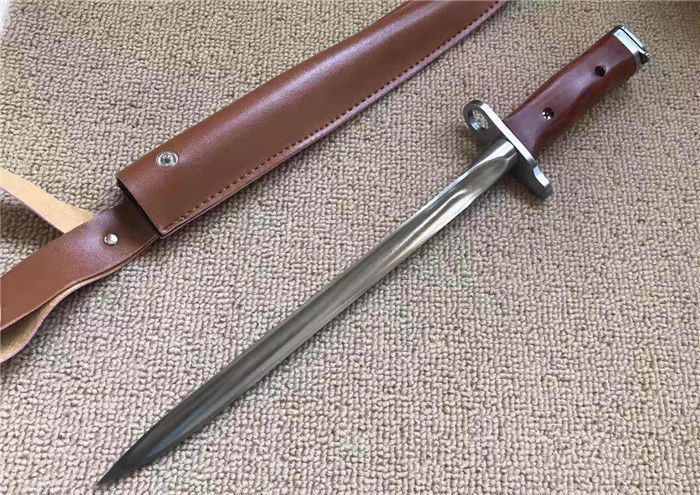 AK三棱军刺(钢本色) 长 度:40CM 刃 长:28.5CM 刀直径:2.1CM 刀 重: 450g 毛 重:500克 硬 度: 56HRC 刀材质:430高碳不锈钢 柄 材:原木 附皮革刀套