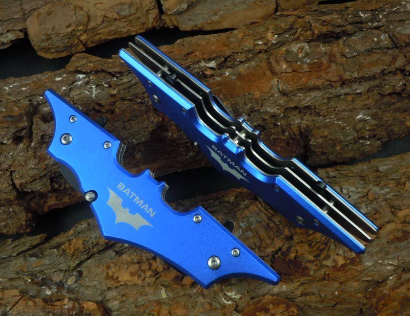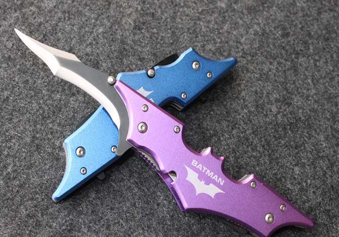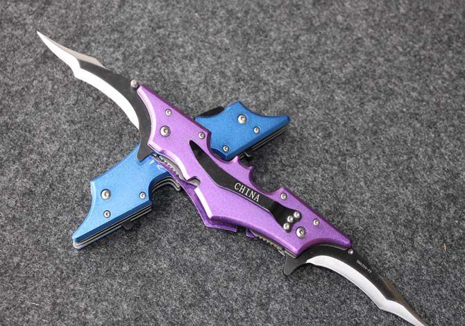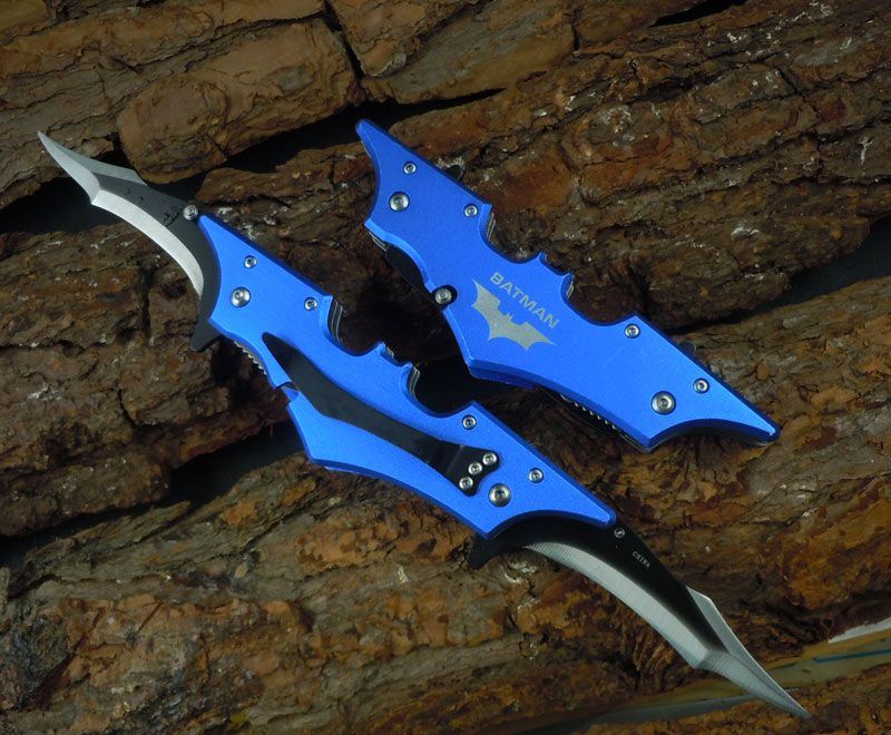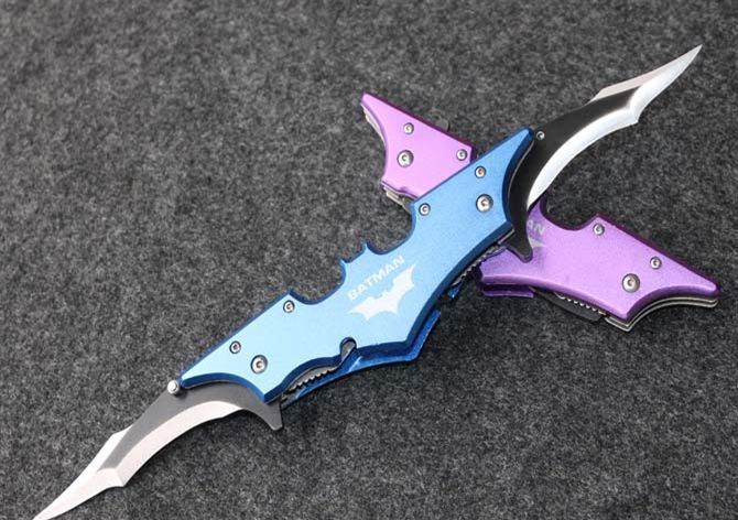 蝙蝠侠双刃战刀(蓝色、粉红色) 全长:28CM(全打开) 刃长:9CM 刃厚:0.25CM 刃材料:3铬13 柄材料:铝 重量:160克 蝙蝠侠-黑夜骑士之双刃战刀,双刃如同蝙蝠之双翅,自动打开,好莱坞经典电影蝙蝠侠收藏系列。