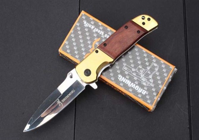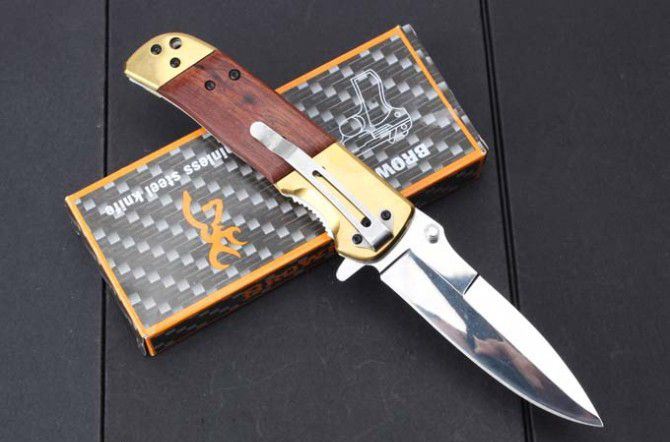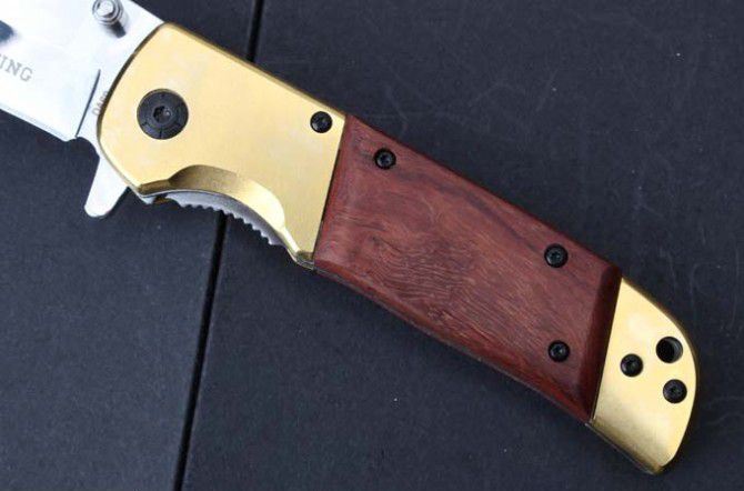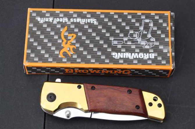 勃朗宁DA69快开折刀 总 长:226mm 刃 长:100mm 柄 长:126mm 刃 宽:29mm 刃 厚:3.8mm 刃 材:5Cr15Mov 重 量:240g(含包装) 硬 度:56HRC 表 面:超镜光 柄 材:双铜头+红木 锁 型:侧锁 其 他:配纸盒