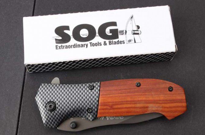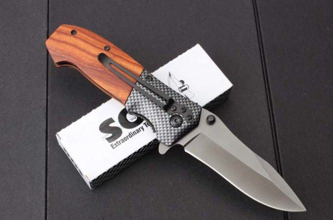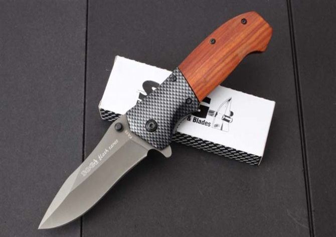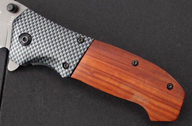 FA16快开折刀 全 长:20.5mm 刃 长:88mm 柄 长:116mm 刃 宽:29mm 刃 厚:3.0mm 刃 材:5Cr13 重 量:175g(含包装) 硬 度:57HRC 表 面:镀钛 柄 材:红木+仿碳纤 锁 型:线锁