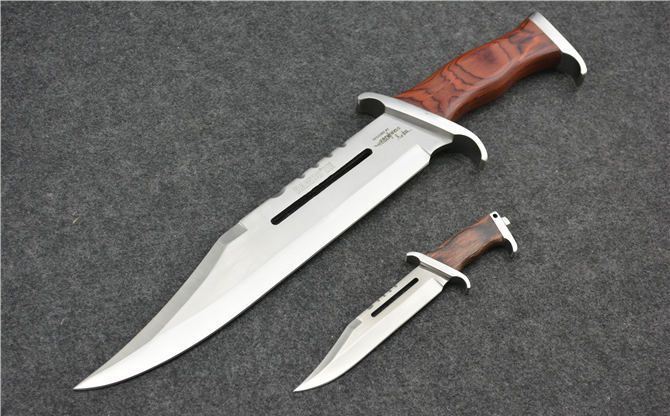 兰博三(迷你版) 全长:18cm 刀刃:12cm 刃厚:0.3cm 刃宽:2.2CM 柄长:6cm 柄材:进口彩木 净重:70克 表面处理:纯手工砂光 兰博刀以其剽悍的外形,强大的功能,吸引了众多真正玩刀的朋友.刀身造型适合于切割、劈砍、突刺,刀背有大而强悍的背齿.刀锋十分精细和锋利。本款迷你款兰博刀3是好莱坞公司电影公司的旅游纪念款,按比例缩小迷你款,具有很高的收藏与实用价值。