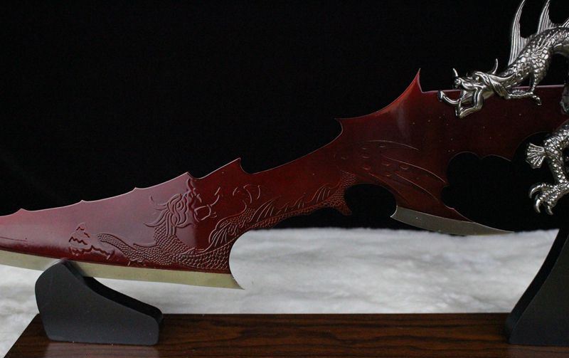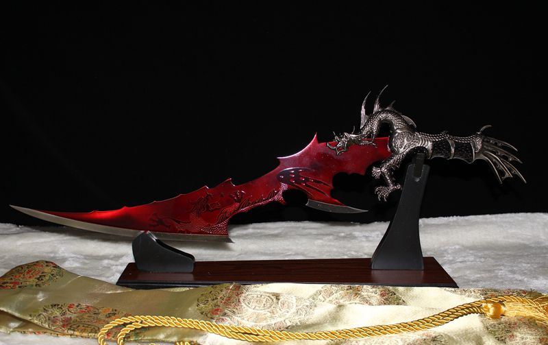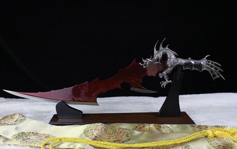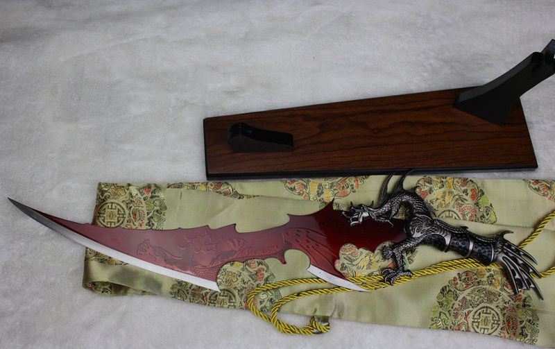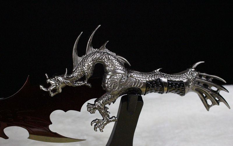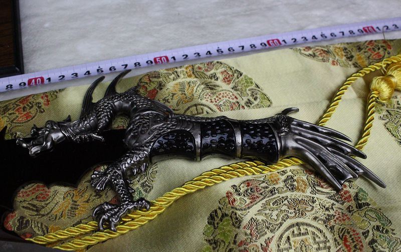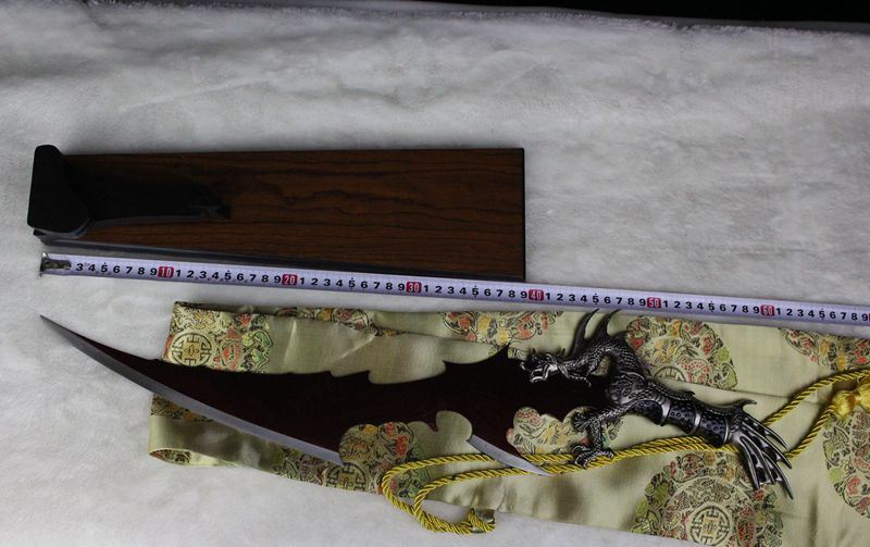 神龙在天装饰刀 长度:63cm 刃长:45CM 刃厚:0.4CM 手柄及配件材料: 锌铝合金/优质不锈钢 剑身材料:不锈钢 整把剑重量: 0.88 公斤 板重0.5 包装:普通瓦楞盒子包装 工艺:锌合金材料,精铸,镀金,不锈钢刀刃