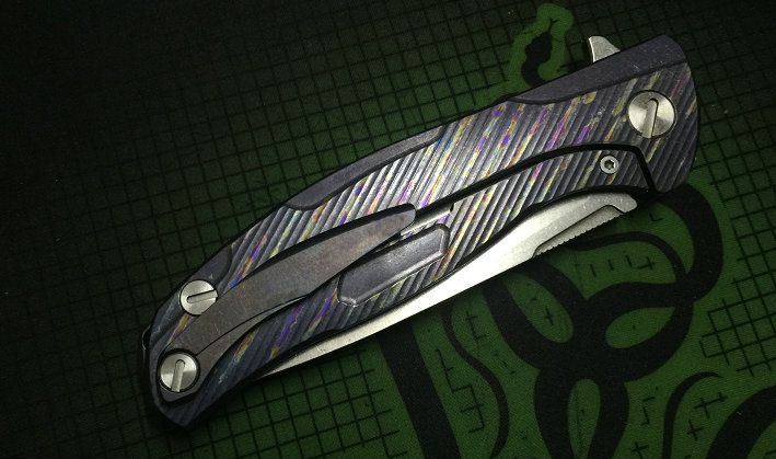 熊头95彩色钛柄折刀 全 长:223mm 刃 长:101mm 柄 长:128mm 刃 宽:28mm 刃 厚:4.0mm 刃 材:D2(深冷处理) 重 量:300g (含包装物) 硬 度:58-60HRC 表 面:石洗 柄 材:手柄全TC4钛合金。 刀 夹:TC4钛合金 锁 型:线锁。 螺 丝:所有螺丝420不锈钢硬度HRC45,全CNC精雕加工 结 构:线锁结构、锁刀接触镶嵌合金粒、陶瓷定位珠、内置平面滚针轴承垫片。 其 他:黑色礼品合+皮套