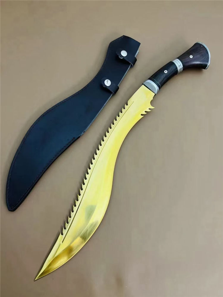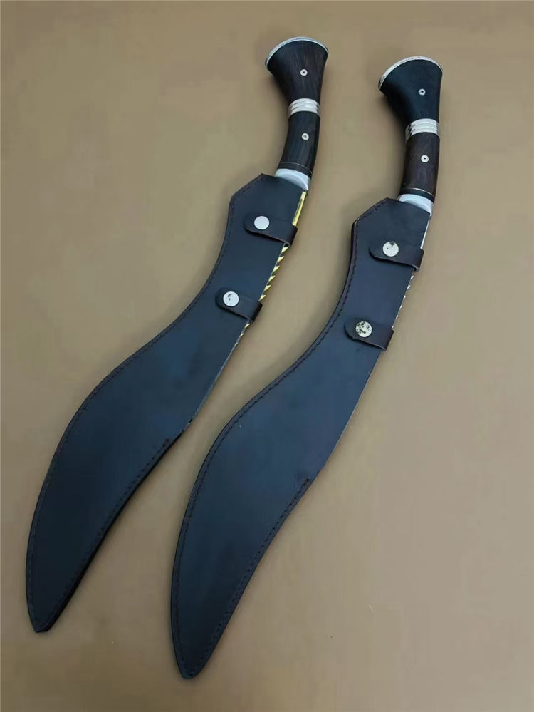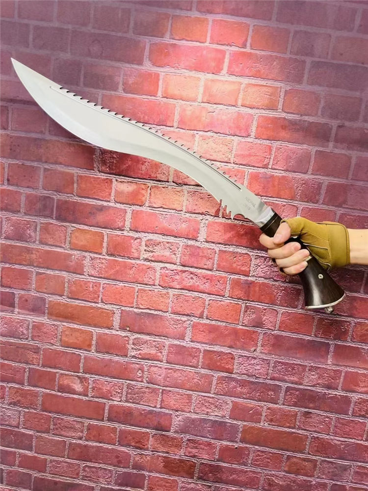 廓尔喀锐霸狗腿刀 全长:61cM 刃长:44CM 厚度:0.58CM 刃宽:6.3CM 硬度:57C 重量: 1451g 含包装: 刃材9Cr13M0V 柄材:非洲花梨木,全刃,镜光,附真皮刀套,彩盒及说明书