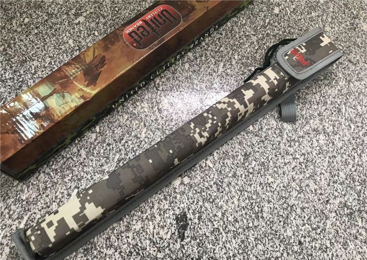 联合刀具United-迷彩三棱(收藏版) 完全反接长度:72.6CM 刃长:24.5CM 完全正合长度:44.2CM 管径:3.2CM 刀径:1.8CM 重量: 930g 硬度: 56HRC 刀材质:440不锈钢 管材: 不锈钢管 柄材: 合金铝 表面:迷彩(不易刮花) 其他:三面血槽 配件;原厂彩盒。高档耐磨加厚尼龙套