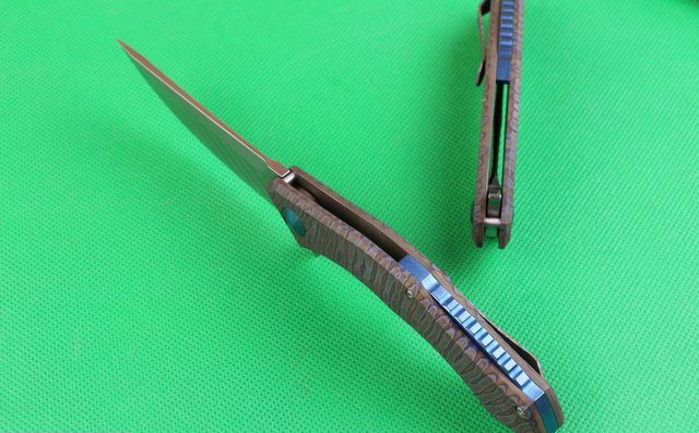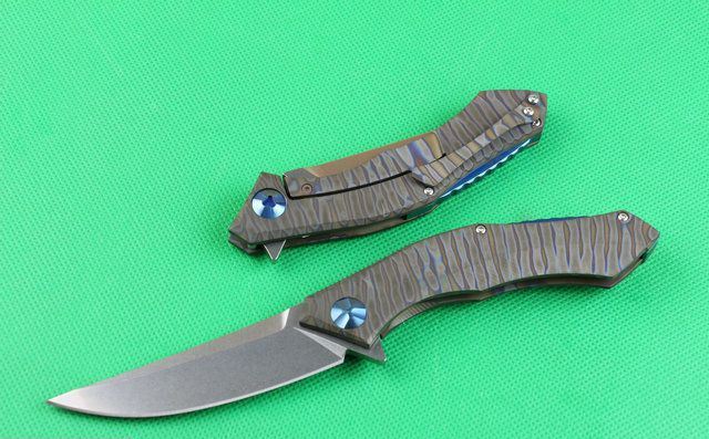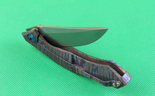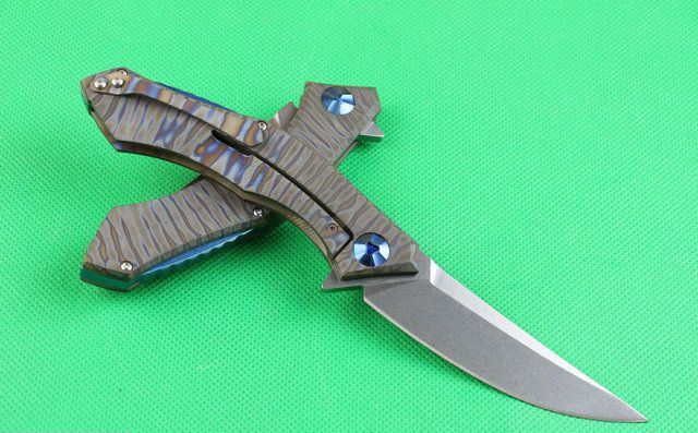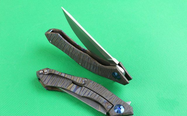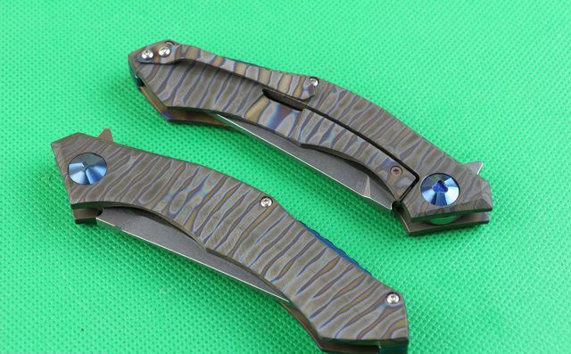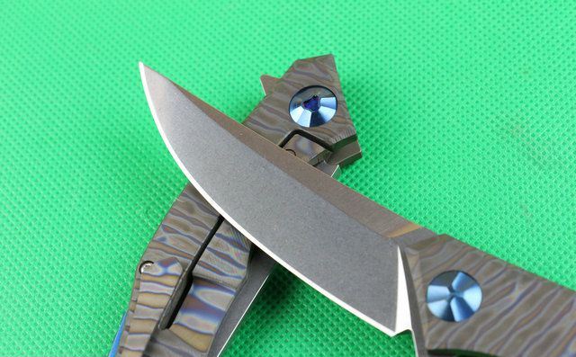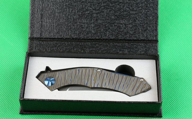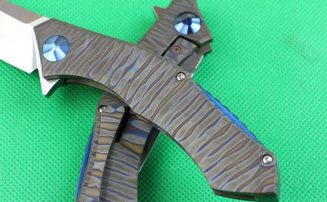 全 长:220mm 刃 长:90mm 柄 长:130mm 刃 宽:26mm 刃 厚:4.0mm 刃 材:D2(深冷处理) 重 量:220g 硬 度:58-60HRC 表 面:火烧纹颜色 柄 材:手柄电脑椤成型钛合金手柄、底骨TC4钛合金蓝色阳极电镀处理。 刀 夹:TC4钛合金 锁 型:分体组合锁杆式线锁。 螺 丝:所有螺丝420不锈钢硬度HRC45,全CNC精雕加工 结 构:一体线锁。陶瓷定位珠,内置平面滚针轴承。 其 它;礼品盒包装