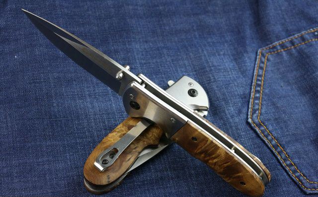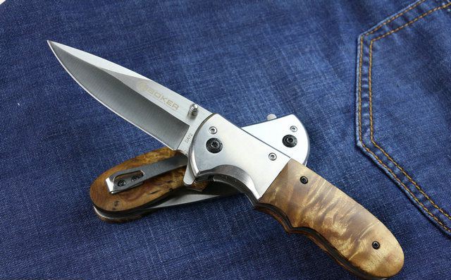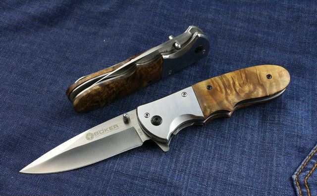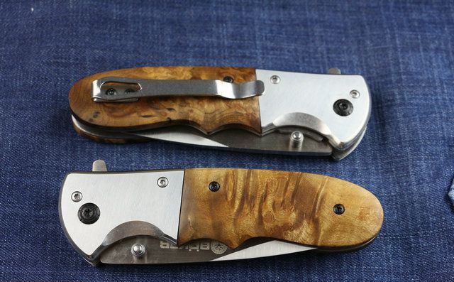 博克DA72快开折刀(红影木) 全 长:20.6cm 刃 长:8.8cm 柄 长:11.8cm 刃 宽:2.8cm(最宽处) 刃 厚:2.8mm 刃 材:5CR13MOV 硬 度:56HRC 刀 柄:钢柄+老树红影木。 表 面:拉丝 重 量:150克 配原厂包装