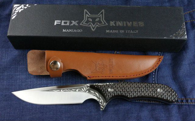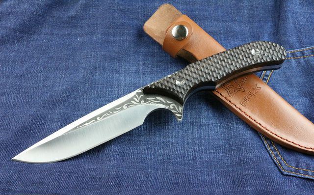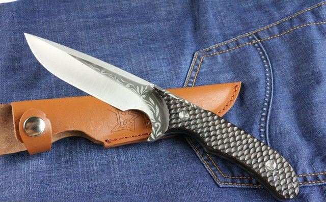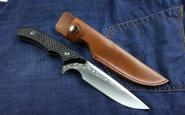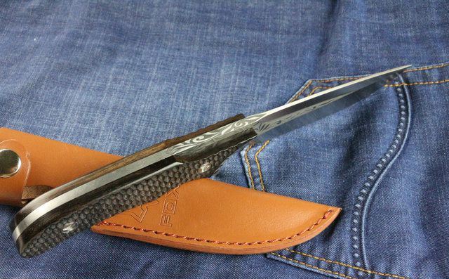 狐狸秋菊直刀 全 长:255mm 刃 长:113 mm 柄 长:133mm 刃 宽:3.2mm 刃 厚:4.7mm 刃 材:7Cr17Wov 重 量:250g(含包装) 硬 度:57HRC 表 面:腐蚀纹 柄 材:黑檀木 其 他:配红色牛皮套+纸盒