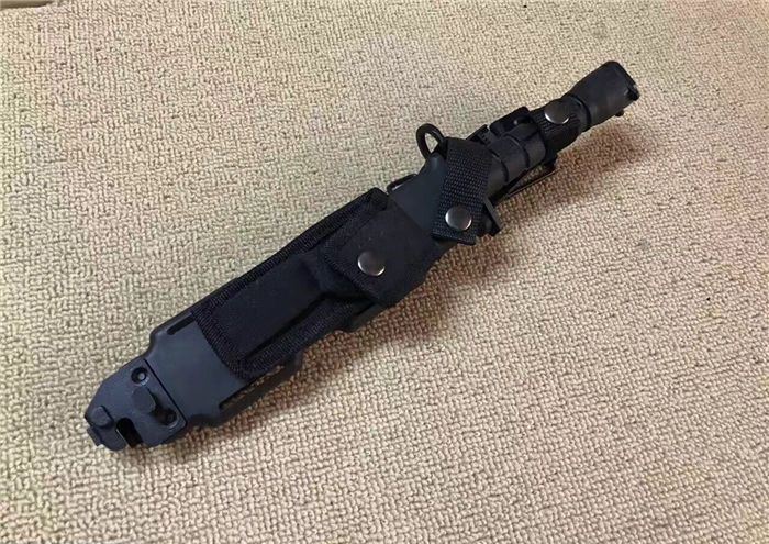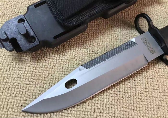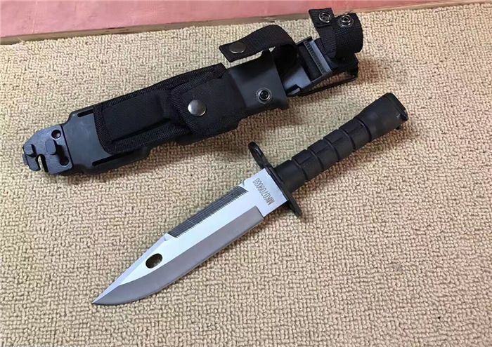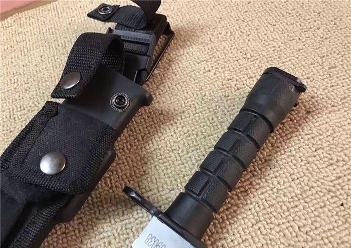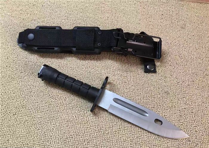 外贸版M9(可拆卸)白刃黑柄 全 长: 32cm 刃 长: 19.8cm 刃 厚: 5.9mm 刃 材: 4CR13 硬 度: 56HRC 重 量: 刀410g+鞘400g 表 面: 钢本色 柄 材: ABS 刀 鞘: ABS