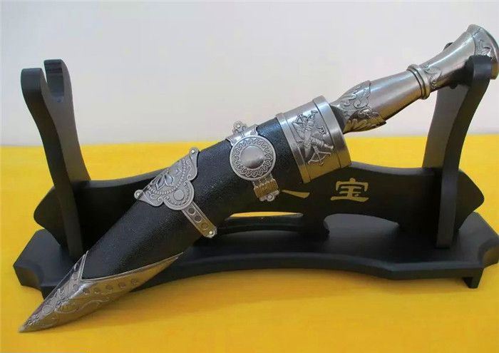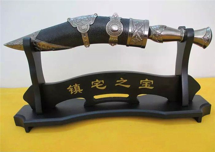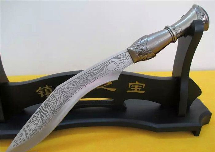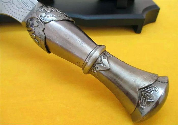 全长:34cm 刀刃:23cm 刃厚:0.3cm 刃宽:3.5CM 柄长:11cm 柄材:铸件 柄厚:3cm 材料:汽车弹簧钢(非常锋利) 硬度:60HRC 净重:400克 毛重:480克(含刀鞘) 表面处理:扎花纹
