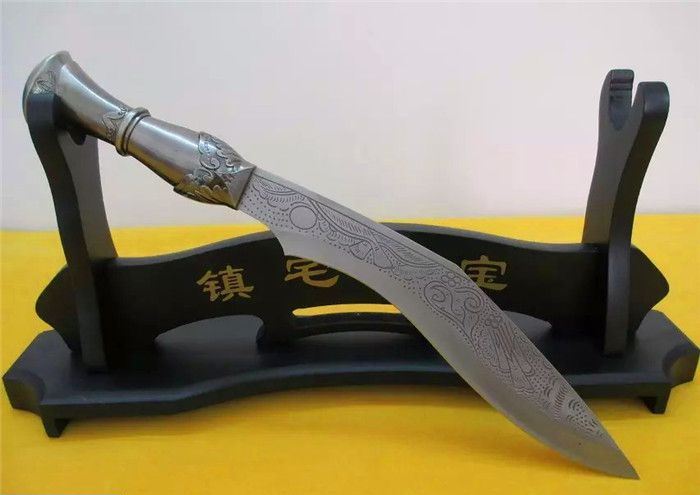 花纹尼泊尔手工狗腿刀 全长:34cm 刀刃:23cm 刃厚:0.3cm 刃宽:3.5CM 柄长:11cm 柄材:铸件 柄厚:3cm 材料:汽车弹簧钢(非常锋利) 硬度:60HRC 净重:400克 毛重:480克(含刀鞘) 表面处理:扎花纹