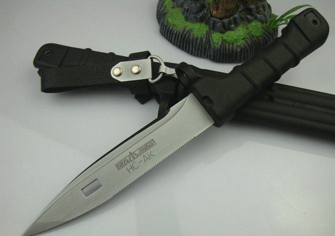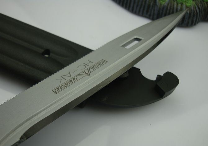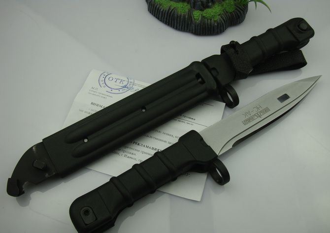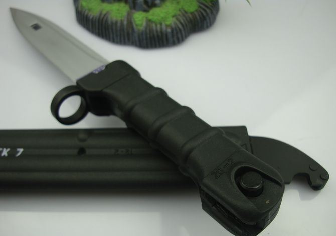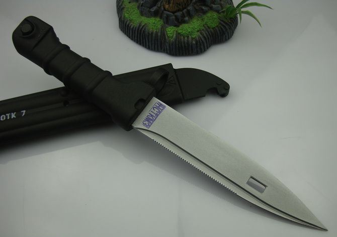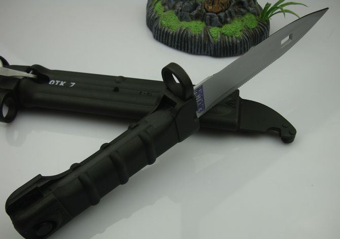 苏联AK74刺刀M3 全长:29.3CM 刃长:14CM 柄长:13.2CM 宽度:3.CM 刀厚:0.35CM 刀重:100克 毛重:410克 钢材:9CR17MOV钢 硬度:58 刀柄:尼龙+纤维 刀鞘:尼龙+纤维