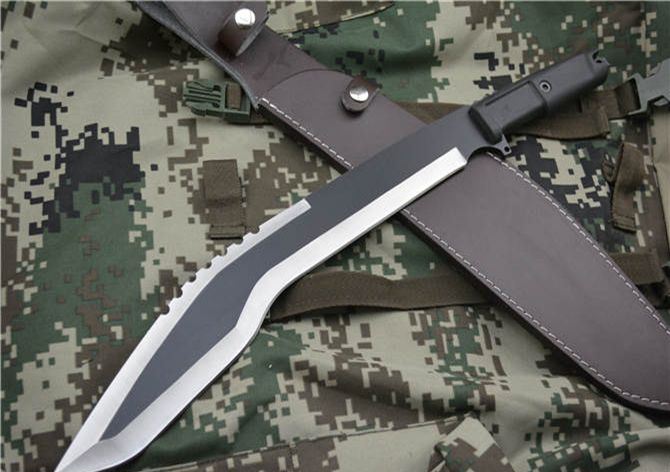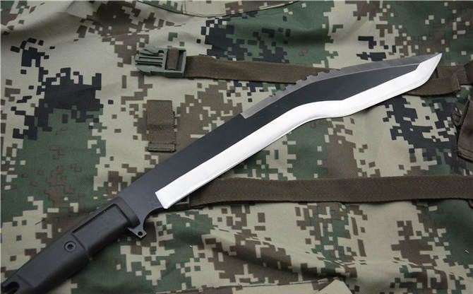 极端武力-暗箭混血儿狗腿刀 全长:52cm 刃长:36.5cm 柄长:12.5cm 刃厚:6mm 刃宽: 6cm 刃材: 5Cr13 柄材: ABS 硬度: 55HRC 毛重:920克 表面处理:氧化黑 配皮套