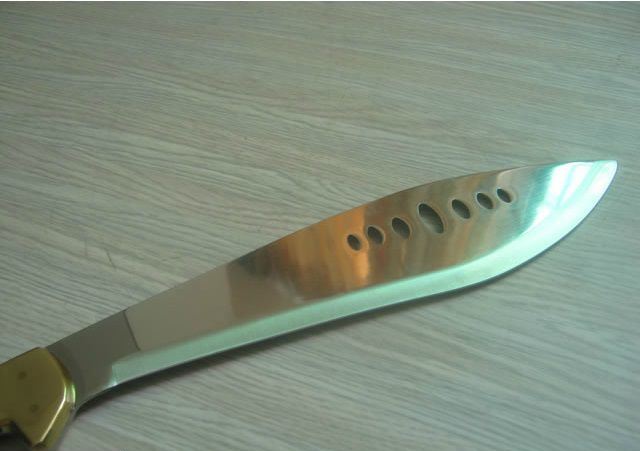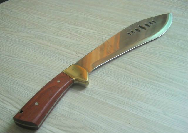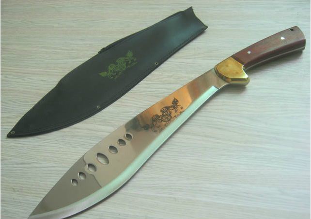 铜头七眼狗腿刀 全 长: 48CM 刃 长: 32CM 刃 厚: 3mm 刃 材: 7铬钢 硬 度: 57HRC 重 量: 600克 表 面: 抛光 柄 材: 彩木 +铜头 刀 鞘: 皮套