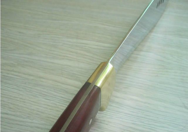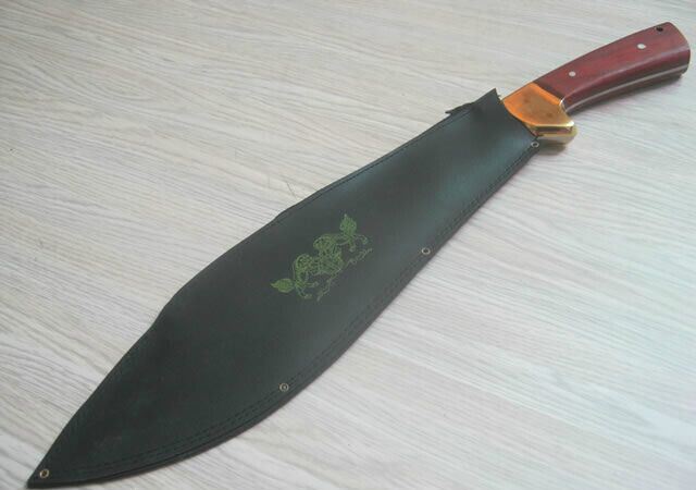 全 长: 48CM 刃 长: 32CM 刃 厚: 3mm 刃 材: 7铬钢 硬 度: 57HRC 重 量: 600克 表 面: 抛光 柄 材: 彩木 +铜头 刀 鞘: 皮套