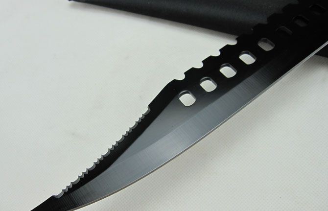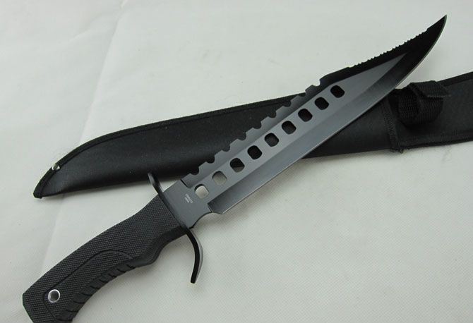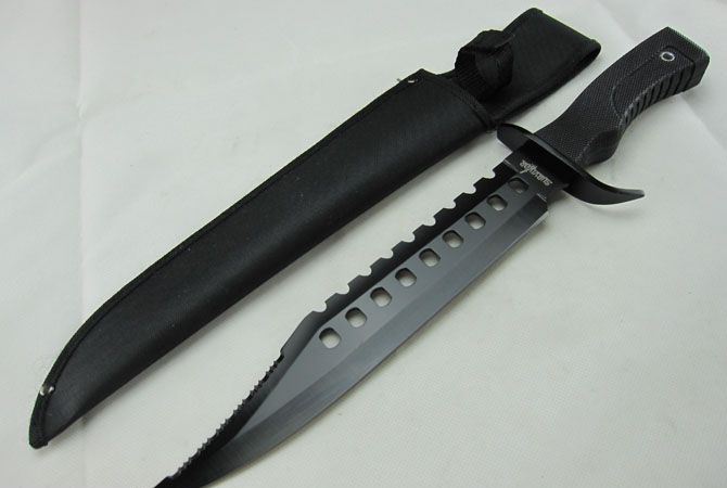 求生者(黑版) 全 长:45.0cm 刃 长:28.0cm 柄 长:14.0cm 刃 宽:4.8cm(最宽处) 刃 厚:3.7mm 刃 材:440 硬 度:55HRC 刀 柄:软塑柄 表 面:发黑 重 量:600.0克 备 注:带尼龙刀套