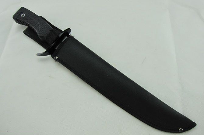 全 长:45.0cm 刃 长:28.0cm 柄 长:14.0cm 刃 宽:4.8cm(最宽处) 刃 厚:3.7mm 刃 材:440 硬 度:55HRC 刀 柄:软塑柄 表 面:发黑 重 量:600.0克 备 注:带尼龙刀套