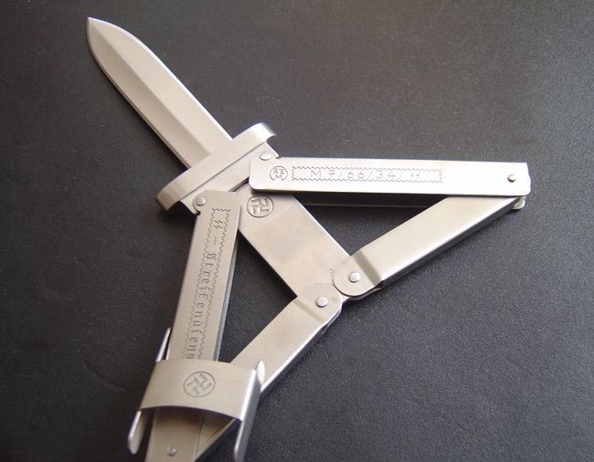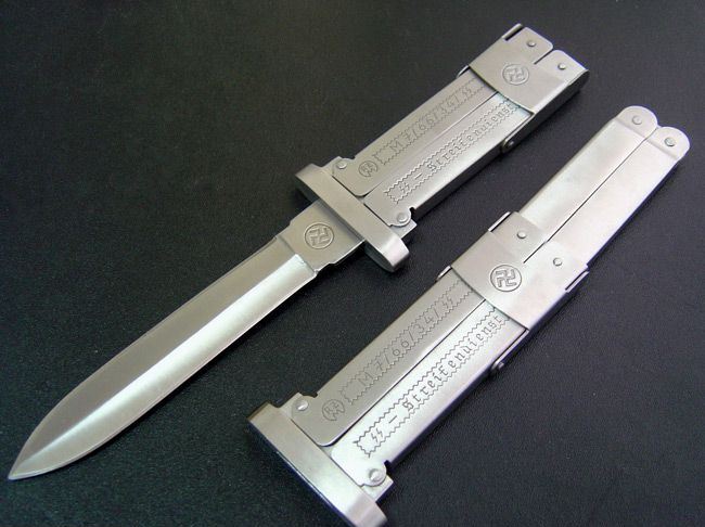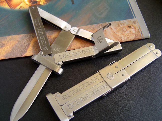全长:19.5CM 刃长:11.0CM 折叠:14.5CM 重量:95G 柄材:全钢 说明:德国纳粹青年团随身的短匕首,隐蔽型非常好,折叠起来压根看不出是刀,从刀身上的文字看仿佛能看到二战时期德国青年狂热的黩武精神!文字经过翻译是纳粹口号“血与荣誉”。刀柄刻有纳粹德国的纳粹标志。