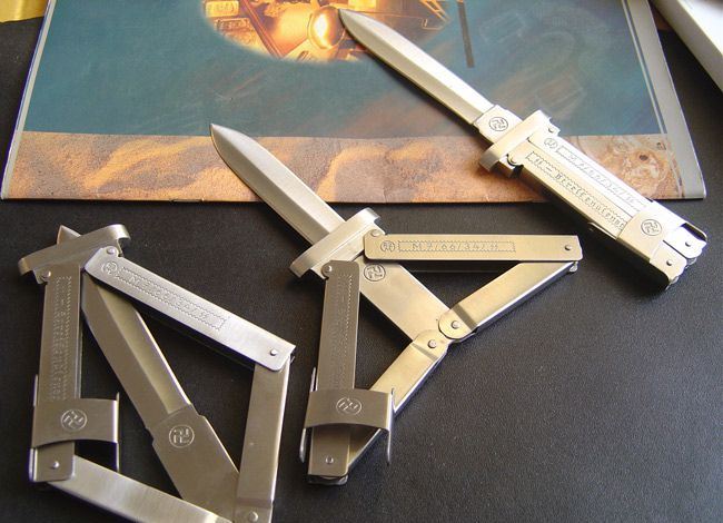 纳粹军官随身小配刀 全长:19.5CM 刃长:11.0CM 折叠:14.5CM 重量:95G 柄材:全钢 说明:德国纳粹青年团随身的短匕首,隐蔽型非常好,折叠起来压根看不出是刀,从刀身上的文字看仿佛能看到二战时期德国青年狂热的黩武精神!文字经过翻译是纳粹口号“血与荣誉”。刀柄刻有纳粹德国的纳粹标志。