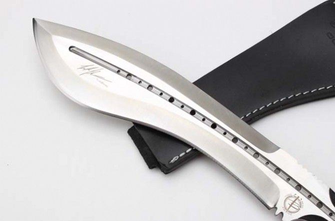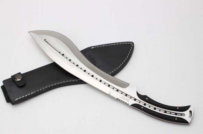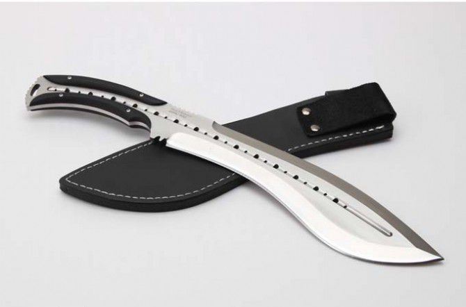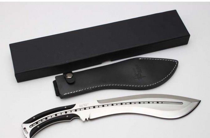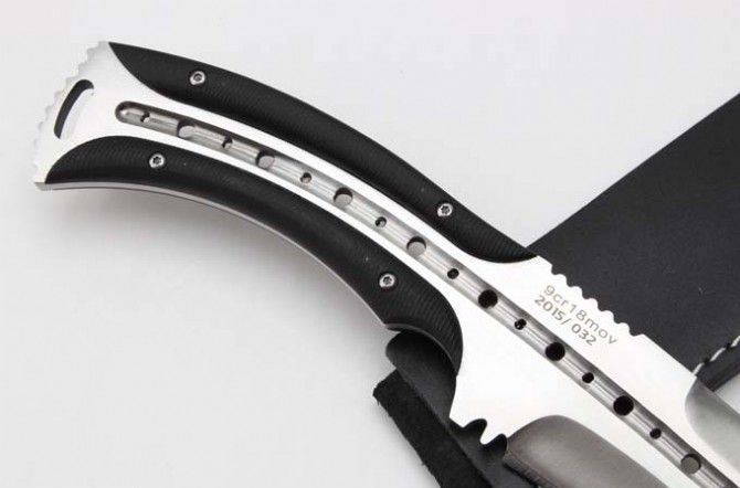 全 长 :355mm 刃 长 :23mm 柄 长 :120mm 刃最宽:55mm 刃 厚 :6mm 刃 材 :9cr18mov 重 量 :560g(含包装) 硬 度 :59-60HRC 表 面 :砂光 柄 材 :钢一体柄+G10条 锁 型 :定锁 其 他 :配牛皮套+牛皮纸盒子 备注:该品的钢材由原来的刃 材:8cr18mov升级为刃 材 :9cr18mov,升级了~~
