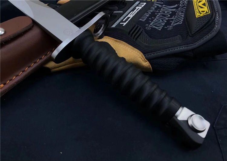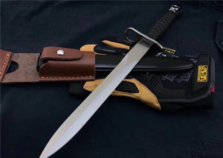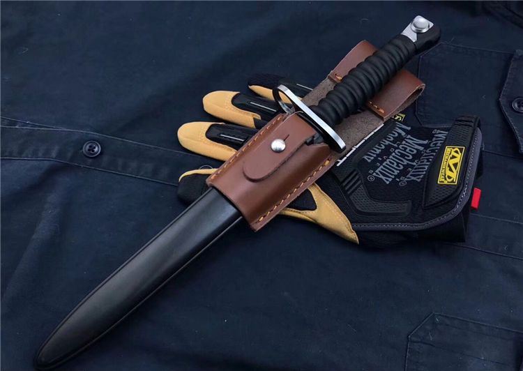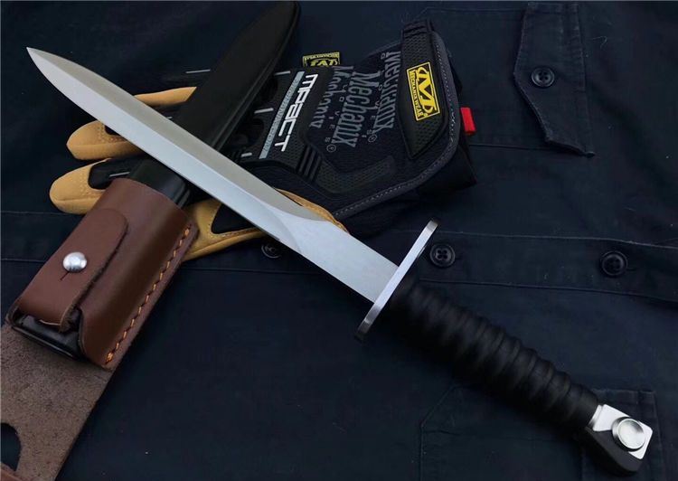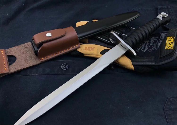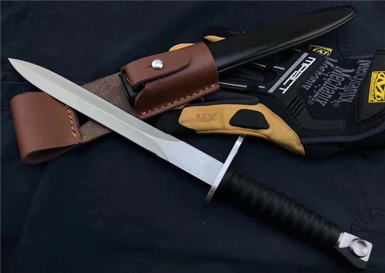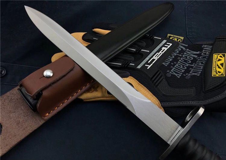 德国S150军刺 全 长:370mm 刃 长:200mm 柄 长:130mm 刃 宽:22mm 刃 厚:5.9mm 刃 材:5Cr13Mov 重 量:420g(含包装) 硬 度:56HRC 表 面:砂光 柄 材:ABS尼龙+波纤注塑 锁 型:定锁 其 他:牛皮纸盒和ABS尼龙+波纤注塑刀套