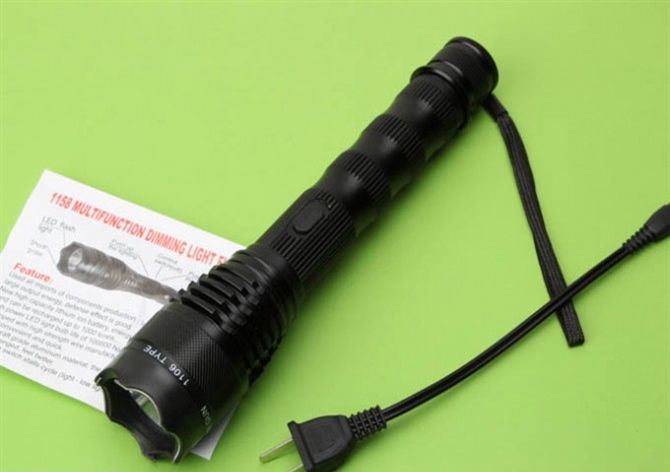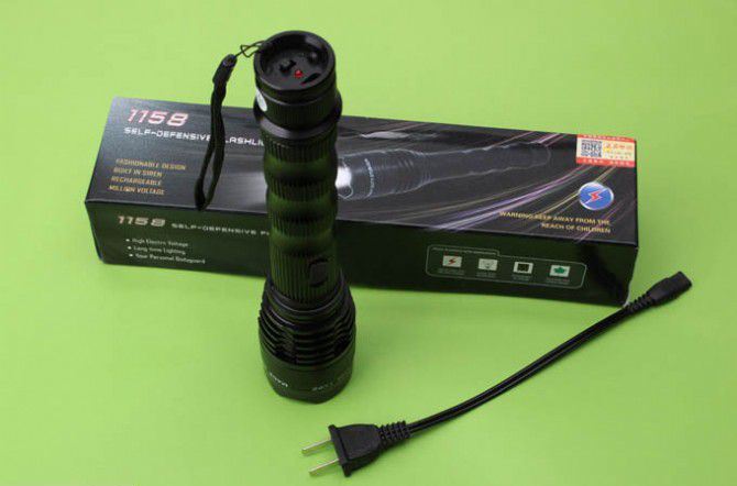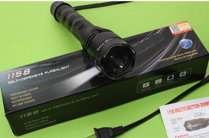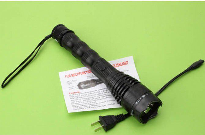 1158高压强光电棍 全长:23.5CM 管宽:4.5CM 重量:267克 净重 输出电压:1000万伏 电源方式:循环充电式