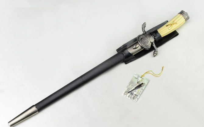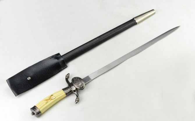 步枪协会佩剑(出口尾货) 全长:51 厘米 剑长:37.5 厘米 柄长:13.8厘米 剑宽:1.9厘米 厚度:0.28厘米 材质:不锈钢 硬度:50HRC 鞘材:外包人造皮和锌铝合金 柄材:锌铝合金+塑料 剑重:446克(含鞘) 整套:544克(含包装)