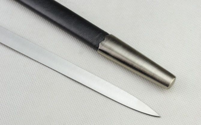 全长:51 厘米 剑长:37.5 厘米 柄长:13.8厘米 剑宽:1.9厘米 厚度:0.28厘米 材质:不锈钢 硬度:50HRC 鞘材:外包人造皮和锌铝合金 柄材:锌铝合金+塑料 剑重:446克(含鞘) 整套:544克(含包装)