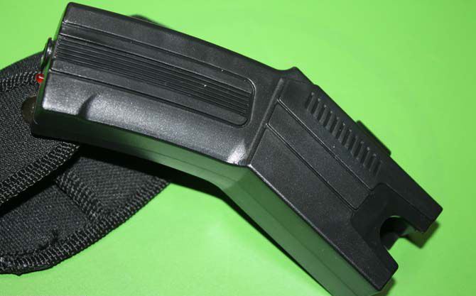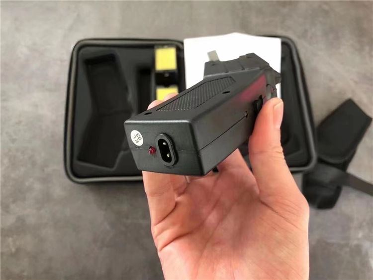 2、手肘置于胃部高度,用右手握住主机,左手打开保险开关,右手拇指按住使用开关及红外瞄准器,瞄准歹徒头部以下范围轻按使用开关,电击镖针就可以射出制服施暴歹徒。