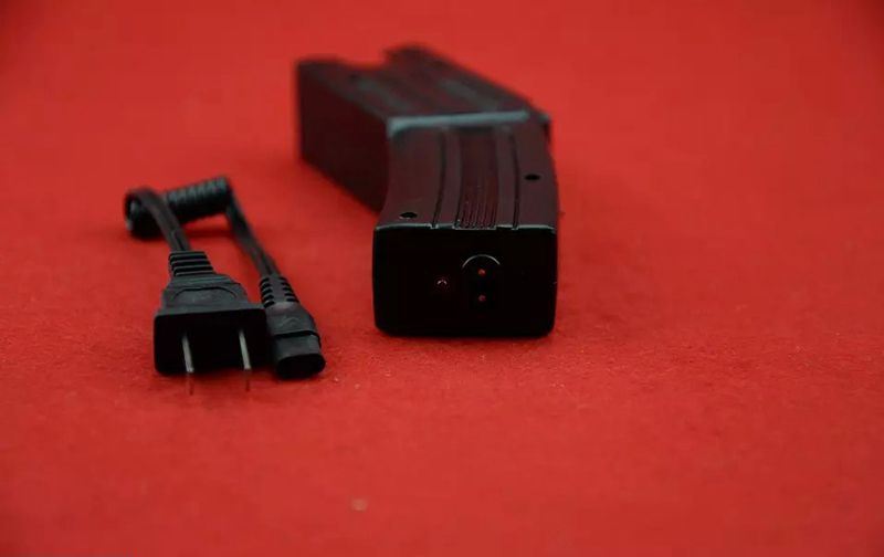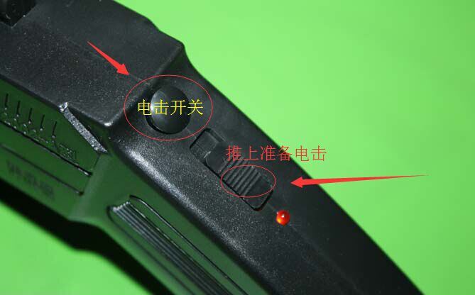 6、在确认安全开关在保险状态下,才能装电击镖弹,装镖弹时不要对着人,手部离开镖弹前部,用手指按镖弹卡口,卡人主机入口,全部装置完成后,在检查无误的情况下把安全开关推至ON处,指示灯闪亮,再按发射开关,爆发一声巨响,此时电击镖针已经按照你的要求击中目标。平时不装镖弹也能作为电击器使用。