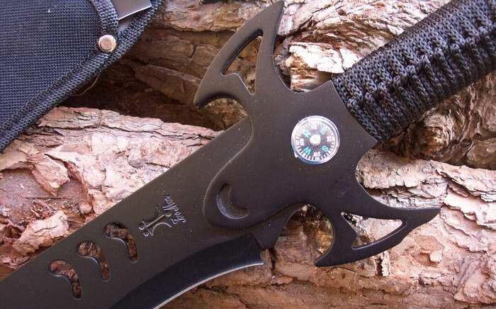 全长:54.0 柄长:14.5 刃厚:0.25 刃宽:6.0 刃材:440C高级不锈钢 硬度:56 颜色:黑 重量:740G 柄材:一体全钢扎带柄 刀鞘:黑色耐磨尼龙刀鞘 备注:刀柄处的指南针为装饰品