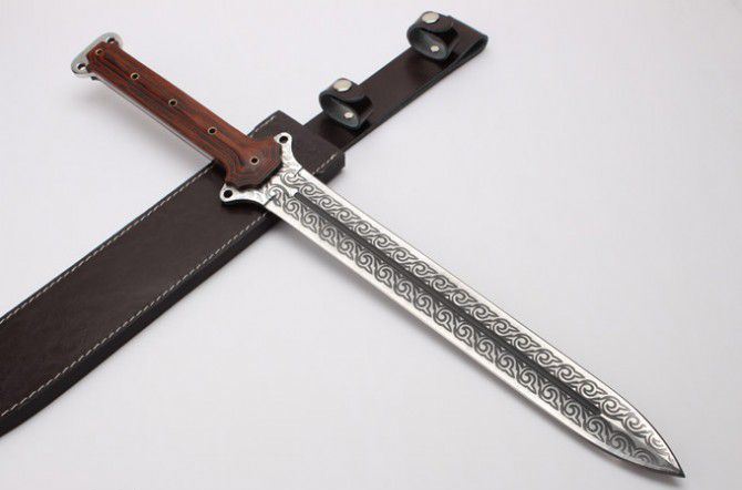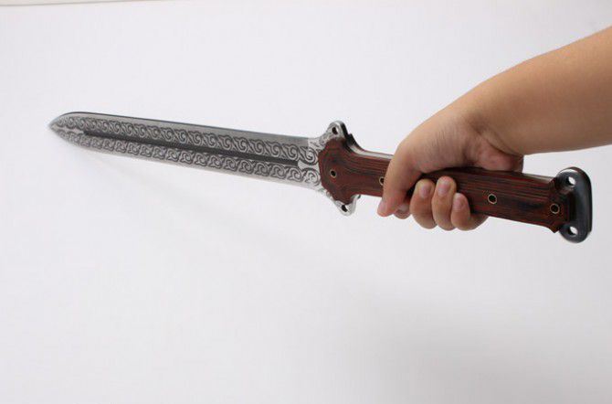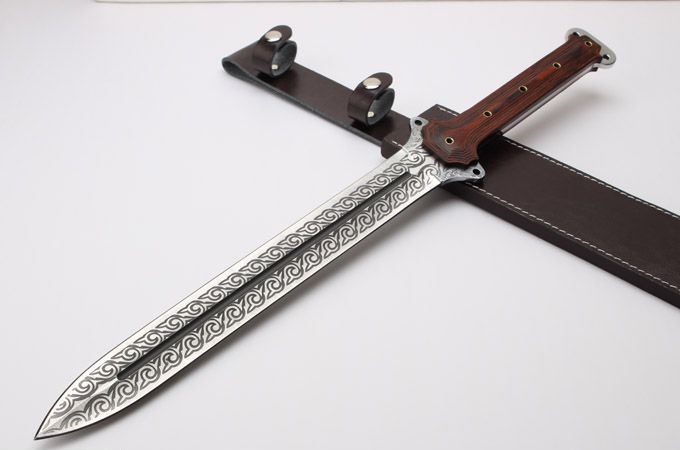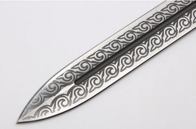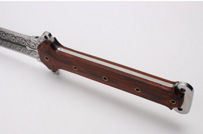 赤焰-剑魔双锋 全 长:590mm 刃 长:370mm 柄 长:220mm 刃 宽:44mm 刃 厚:5.5mm 刃 材:8Cr18Mov 重 量:1095g(含包装) 硬 度:57HRC 表 面:雕花 柄 材:彩木 锁 型:定锁 其 他:配优质牛皮套和纸盒 独特的设计新颖而出,刀刃雕花加上手柄是雕刻条纹柄手感好防滑。非常经典的作品。