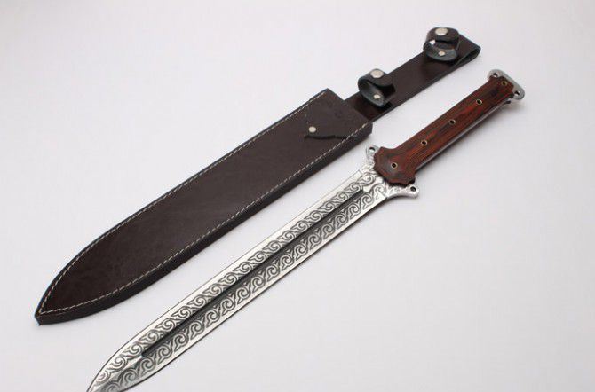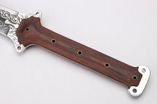 全 长:590mm 刃 长:370mm 柄 长:220mm 刃 宽:44mm 刃 厚:5.5mm 刃 材:8Cr18Mov 重 量:1095g(含包装) 硬 度:57HRC 表 面:雕花 柄 材:彩木 锁 型:定锁 其 他:配优质牛皮套和纸盒 独特的设计新颖而出,刀刃雕花加上手柄是雕刻条纹柄手感好防滑。非常经典的作品。