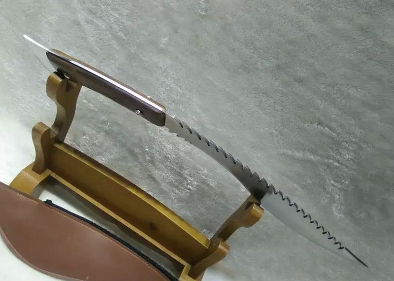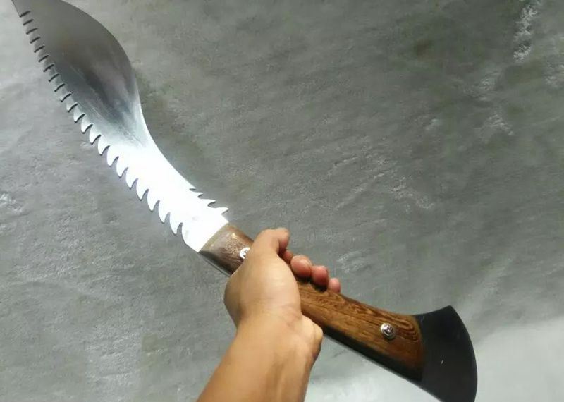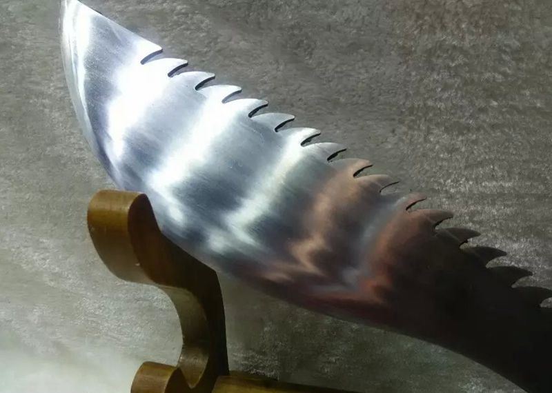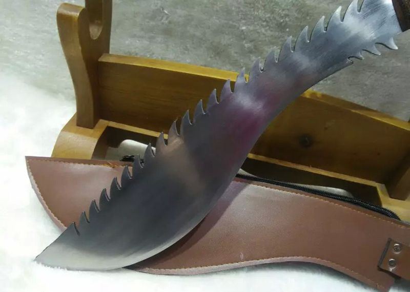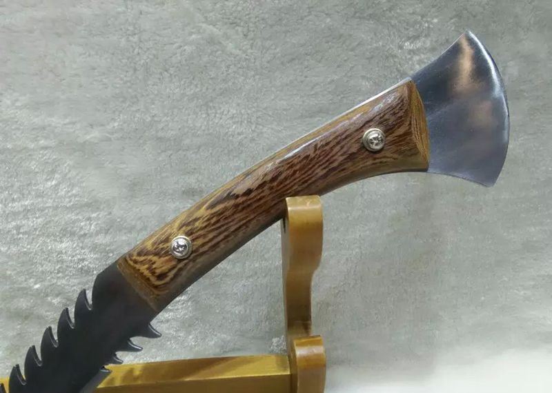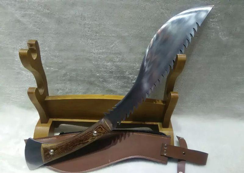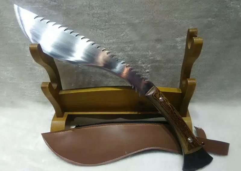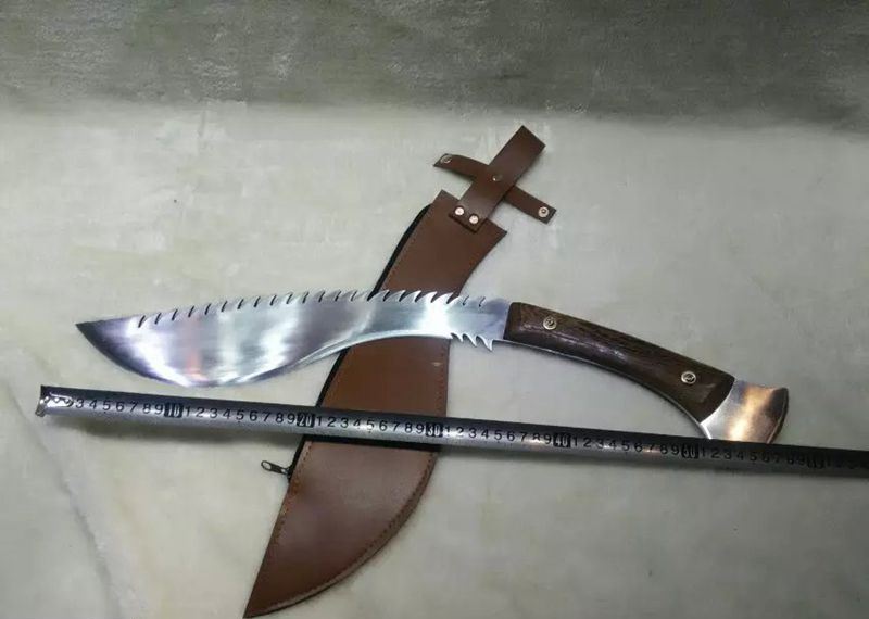 狂野长狗腿(手工锻打) 全长:60cm 刃长:36cm 柄长:24cm 刃宽:9cm 刃厚:0.6cm 刃材:高碳钢 硬度区间:刃口59HRC 刀身:56HRC 加工工艺:百炼高碳钢,手工折叠锻打,传统古法13道研磨。 柄材:花梨木+铆钉 鞘材:皮套 总重:1380g (含皮套及锦盒) 性能:削纸断竹砍铁丝 备注:手工产品存在误差,规格仅供参考,请以实物为准! 温馨提示:本品不含刀架,刀架需另购,谢谢