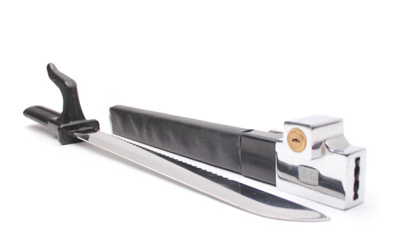 防盗镜光车锁 产品尺寸:长62CM 高9.5CM 刀身总长:约45CM 产品重量:毛重2.2kg/净重3.6kg 产品材质:精钢合金 真皮 产品颜色:银黑色 产品配件:原装钥匙两把 产品属汽车方向盘锁,仅用于汽车防盗功能,内含刀具未开刃,禁止当作武器斗殴。 内部刀具采用美国军工材质,纯手工打造,材质坚硬,表面光滑镜。 外层由头层牛皮纯手工缝制,做工精细,层显奢华大气,贵族品质。