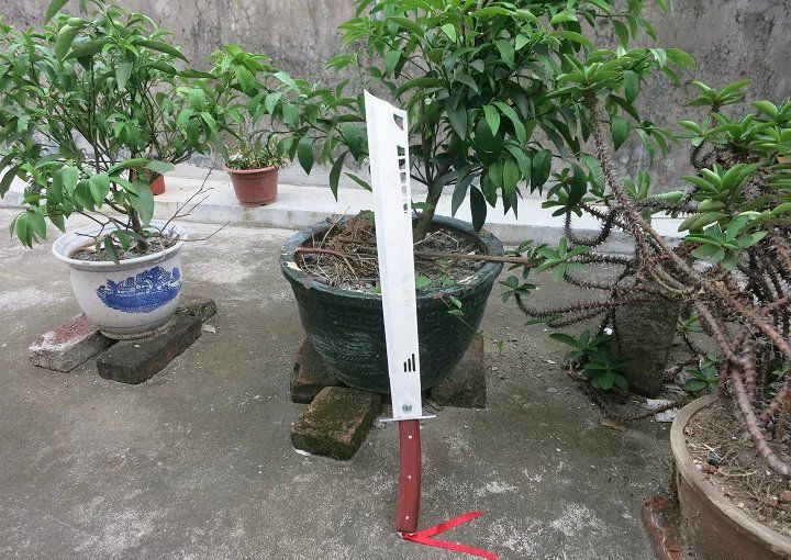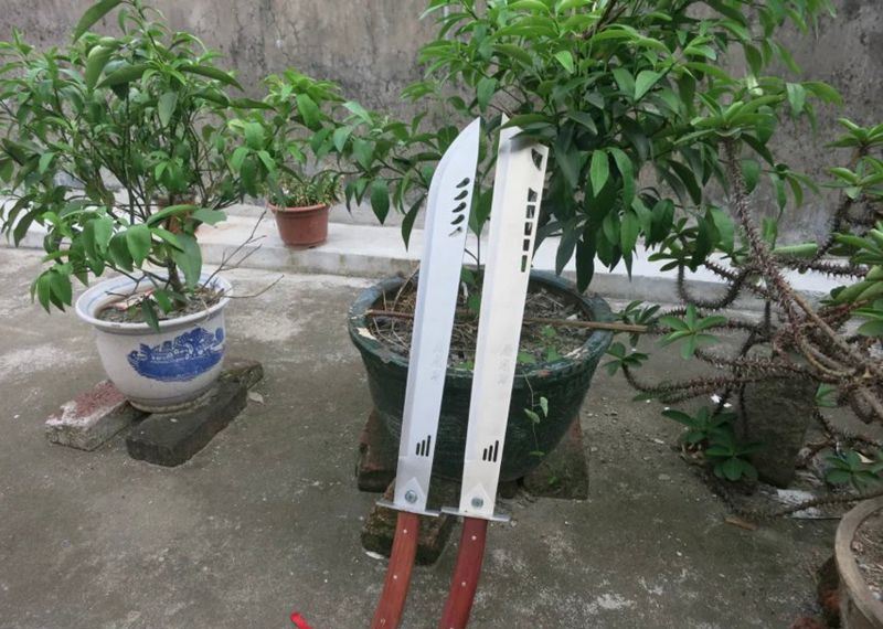 总长:69.5CM 刃长: 52CM 刃材: 420 硬度: 54-56HRC 表面: 沙光 刃厚: 0.3cm 柄长: 17.5cm 柄材: 全钢通柄+原木 重量: 770克 尼龙鞘