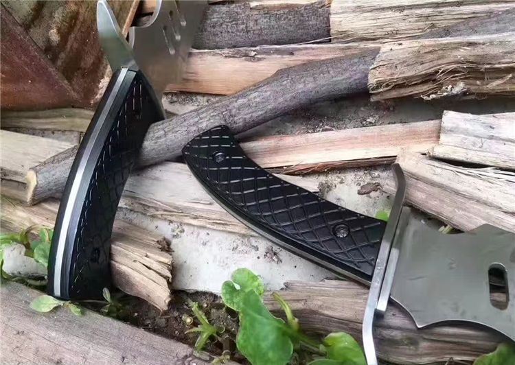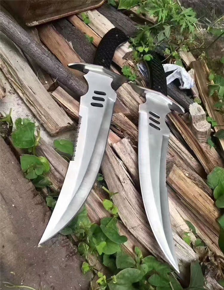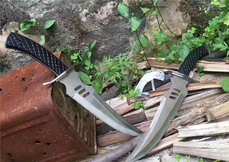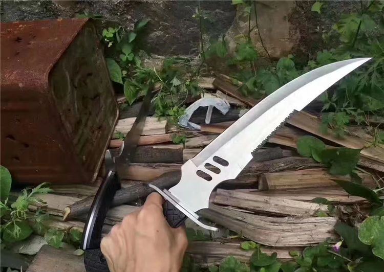 狼牙追魂开山弯刀 全长:41cm 刃长:25cm 柄长:12.5cm 刃厚:4mm 表面:砂光 刃材:440 硬度:55HRC 刀柄:彩木 重量:550g 备注:带尼龙刀套