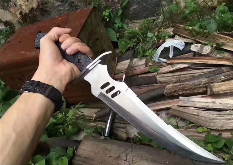 全长:41cm 刃长:25cm 柄长:12.5cm 刃厚:4mm 表面:砂光 刃材:440 硬度:55HRC 刀柄:彩木 重量:550g 备注:带尼龙刀套