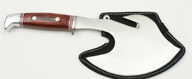 开路斧 全 长: 29.0cm 刃 长: 15.0cm 柄 长: 11.2cm 刃 材: 440 不锈钢 硬 度: 56 HRC 表 面: 砂光 刃 厚: 0.53cm 净 重: 460.0g 其 他:全刃开锋,附尼龙套