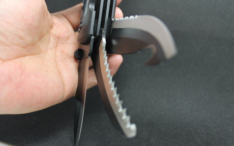 奔驰多功能刀 全长:21cm 刃长:8cm 刃厚:0.25cm 刃宽:2.6cm 柄长:12.5cm 柄厚:2.7cm 钢材:5Cr15 硬度:57HRC 毛重:205克 表面处理:纯手工拉砂 功能:折叠刀/绳割/双齿锯